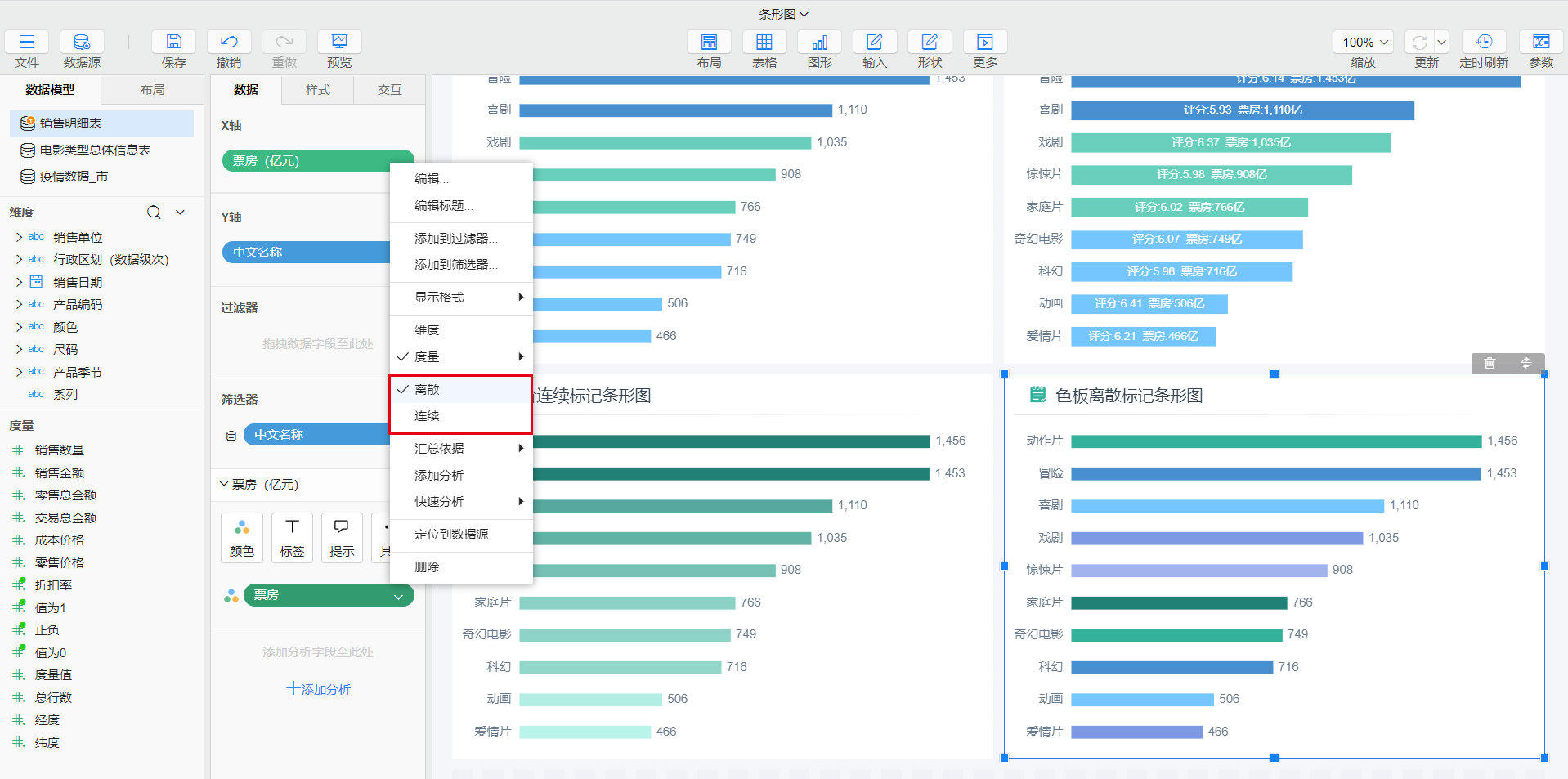将度量【票房】拖到y轴系列值下的颜色,右键选择连续或离散。
