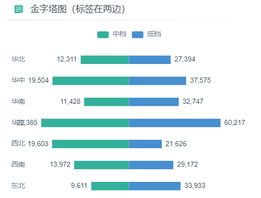 双向条形图又称金字塔图,一般用于对比不同维项下两个不同指标数据的表现。如各大区中档服饰和低档服饰的销售数量对比: