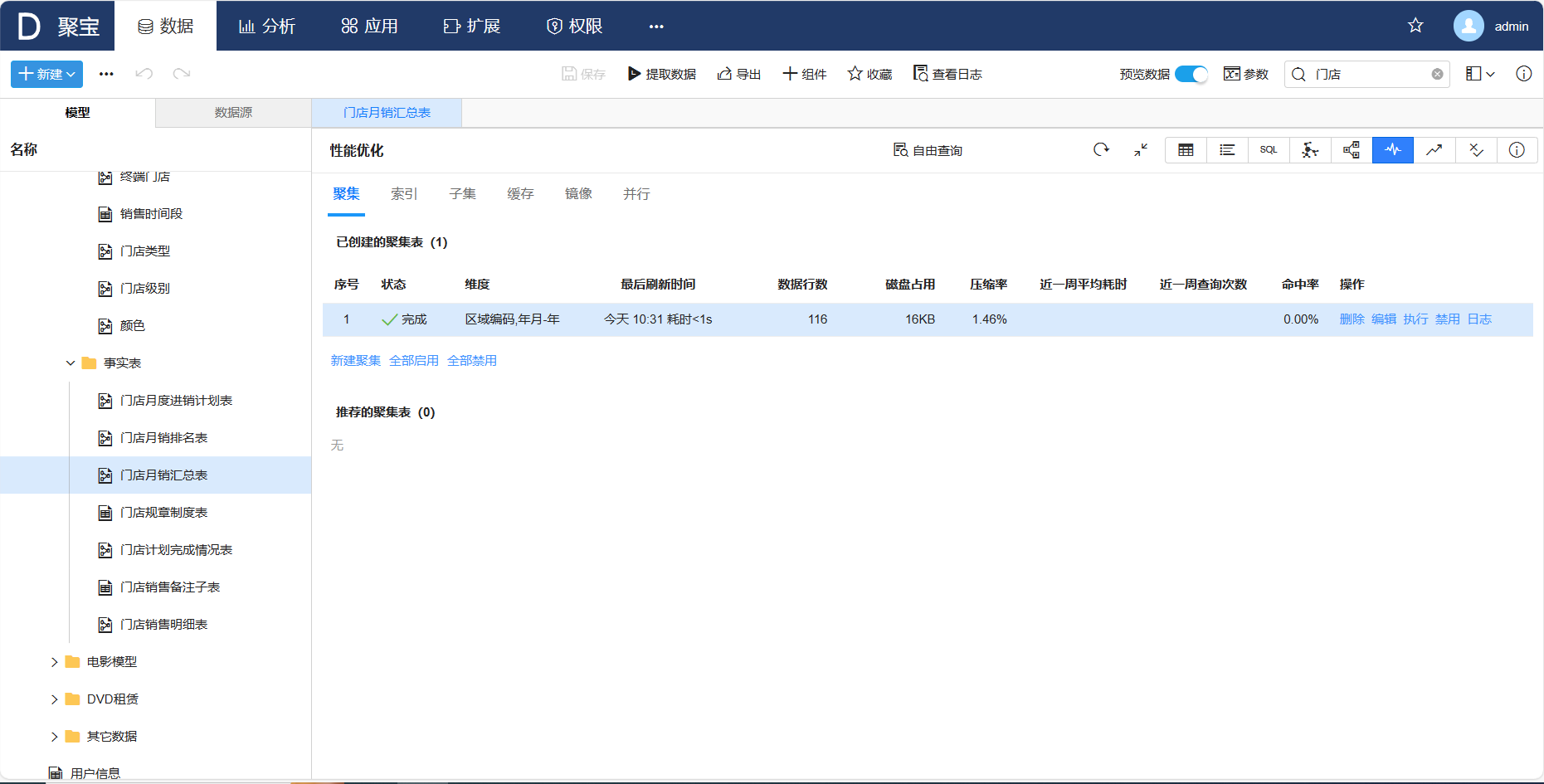 门店月销汇总表中切换至性能优化 > 聚集 - 新建聚集:点击新建聚集,弹出对话框