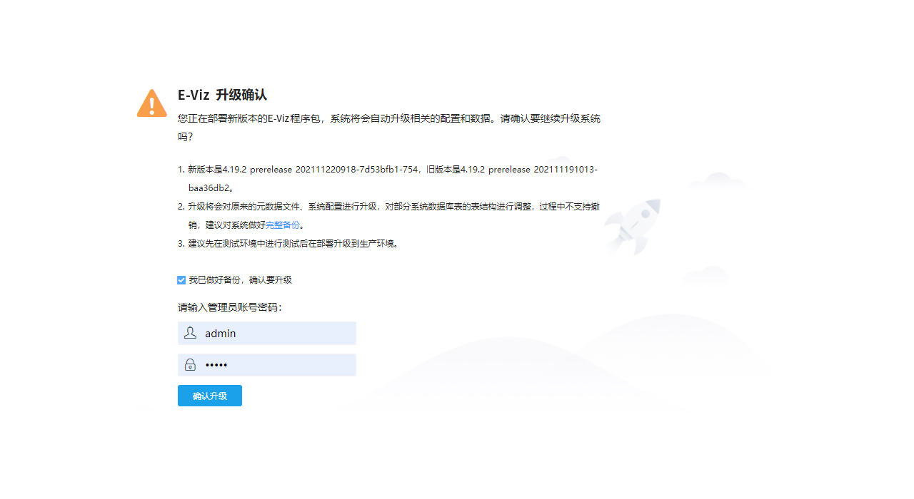 替换WAR包并重启tomcat后,系统会先显示升级确认页面(当新的WAR包版本号的前2位与老版本有变化时才会提示确认页面,第三个版本号变化属于BUG修复并不会提示确认),用户需确认升级版本号是否正确,并输入管理员账号密码后才能开始升级。