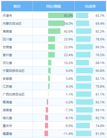 - 使用红色文字标注同比增幅小于10%的省份