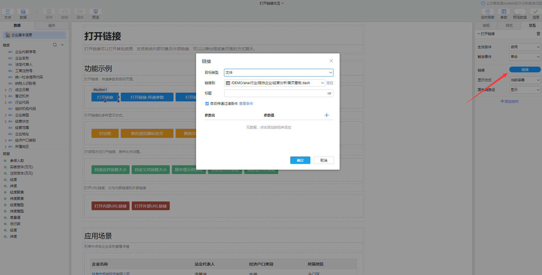 打开链接交互用于跳转到其他对象,支持系统内部对象及外部链接,可以以弹出对话框或页面的方式展示。如列表展示各企业信息,点击企业名称查看企业详情: