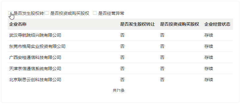 勾选框和单选框本身不具备自动过滤的功能,当需要使用该组件过滤其它组件数据时,例如根据勾选框是否发生股权转让过滤列表数据,可以如下方式实现: