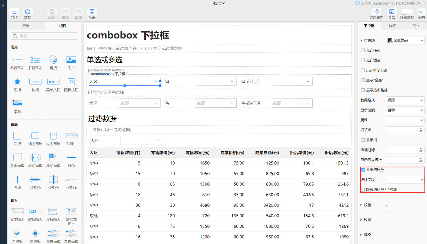 区域编码,设置属性为大区,更多的属性设置见下拉列表为模型数据 - 设置自动过滤:在属性栏>下拉框>过滤中勾选自动过滤,在条件字段中选择