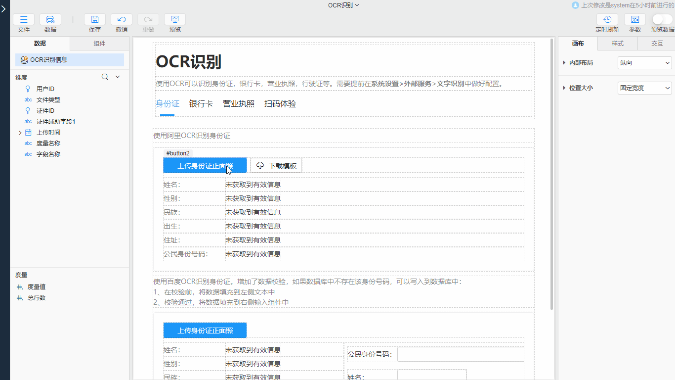 SuperPage中提供了OCR识别交互,利用互联网上的OCR服务(使用OCR服务需要系统配置好外部服务信息,在系统设置>更多>外部服务>文字识别中启用相应服务并添加对应参数,可参考文档文字识别)识别证件图片中的文字信息。如点击按钮上传身份证照片后获取身份证号码和姓名: