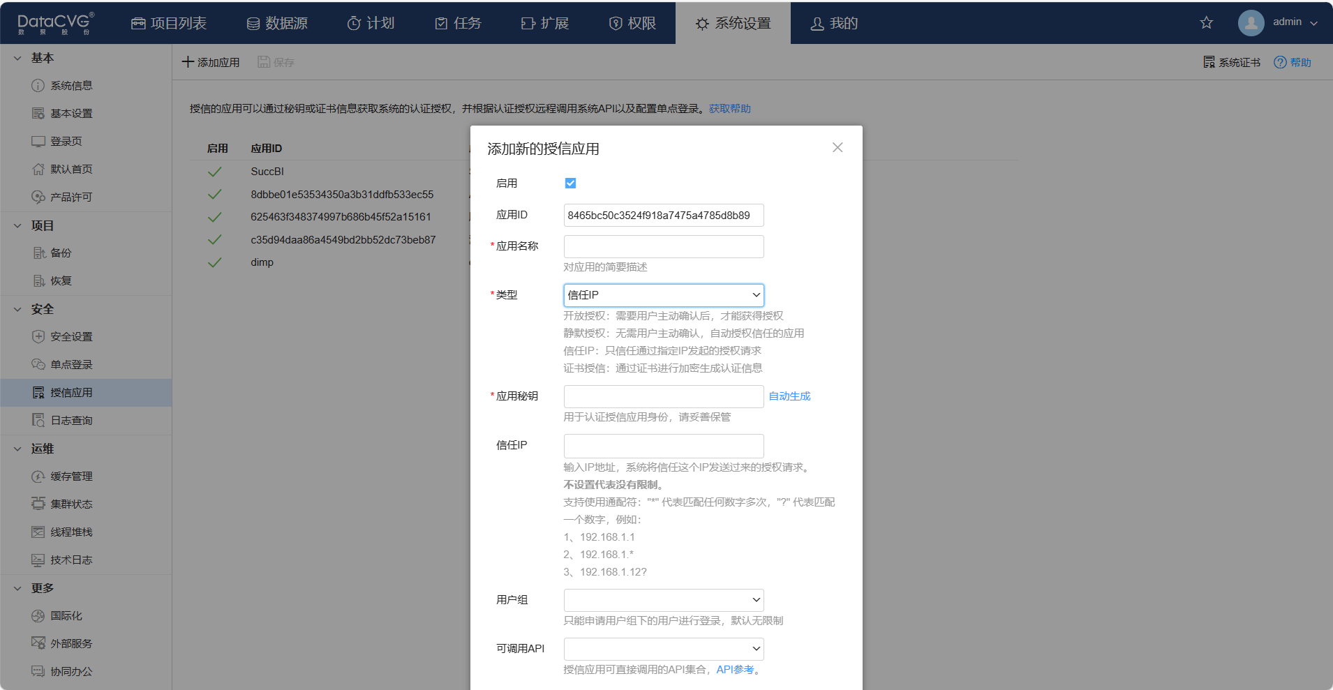 - 用户组:用于限制第三方系统可以申请那些用户用于登录,不填则默认可用使用系统中的所有用户。